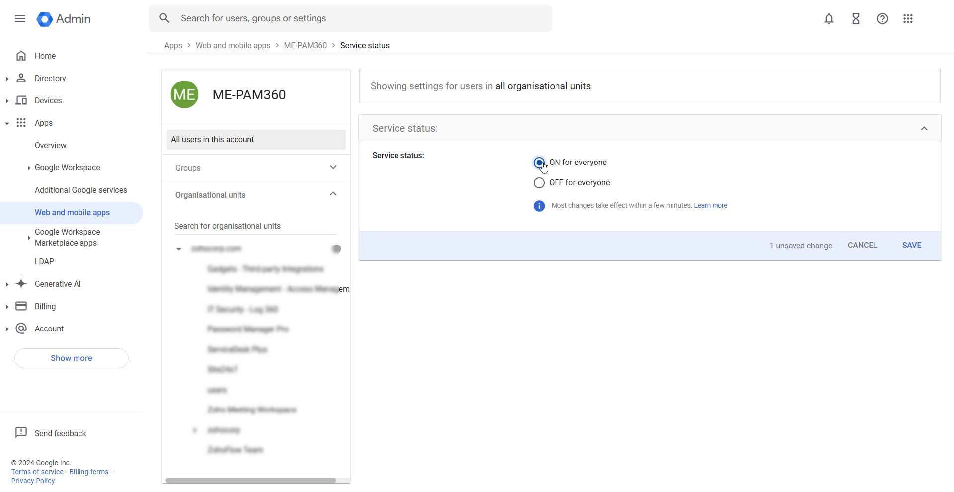 After setting up SAML SSO, you must enable user access to the PAM360 custom SAML application within the Google Admin Console to allow users to log into PAM360 using SAML SSO. User access to the PAM360 custom SAML application is turned off by default. Follow these steps to enable user access: