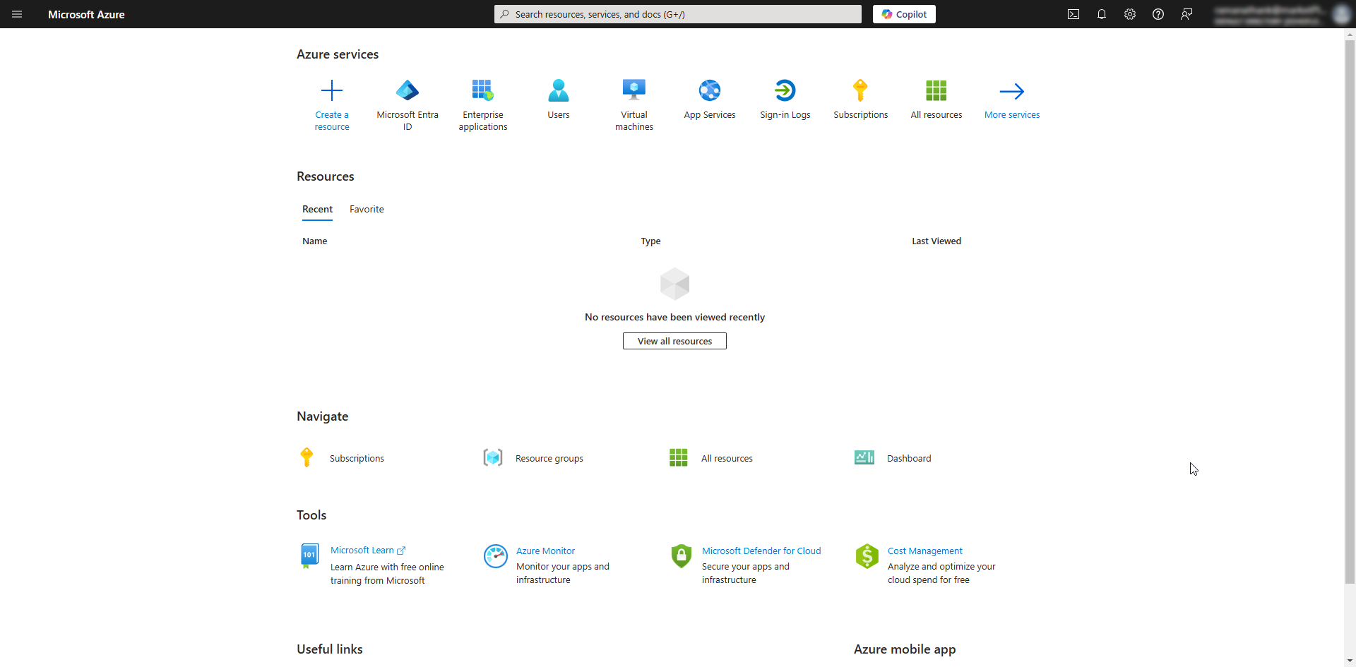 - Select Microsoft Entra ID under the Azure services section on the Microsoft Azure home page.