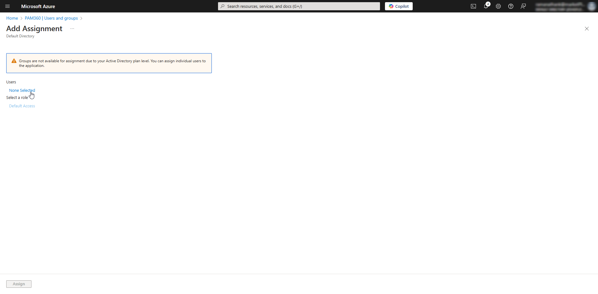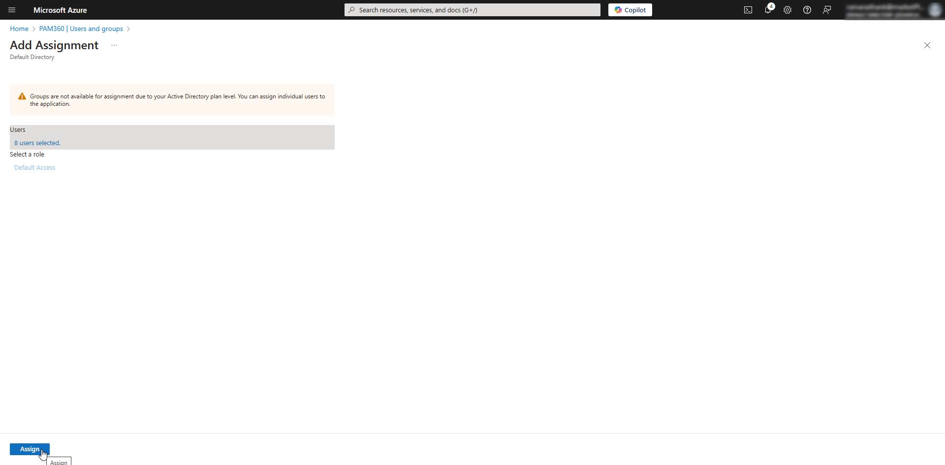 - Click Assign to assign the selected Entra ID users to the PAM360 enterprise application.