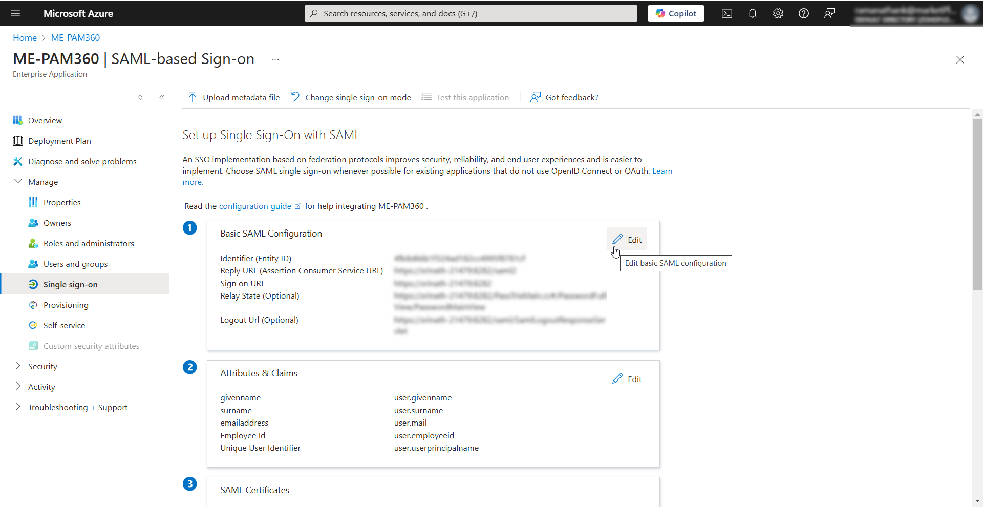 - Click the Edit icon beside the Attributes and Claims section on the PAM360 Enterprise Application page.