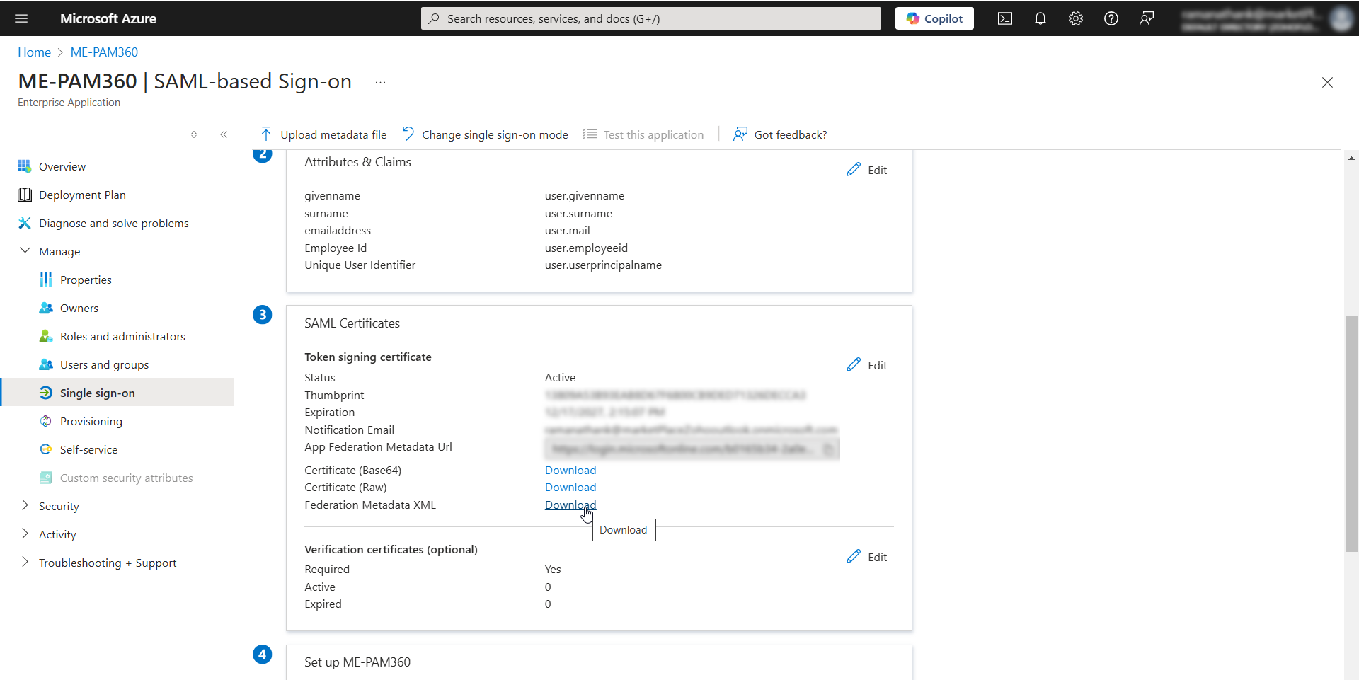 - To download the IdP details as a metadata.xml file, click the Download button beside the Federation Metadata XML field under the SAML Certificates section.