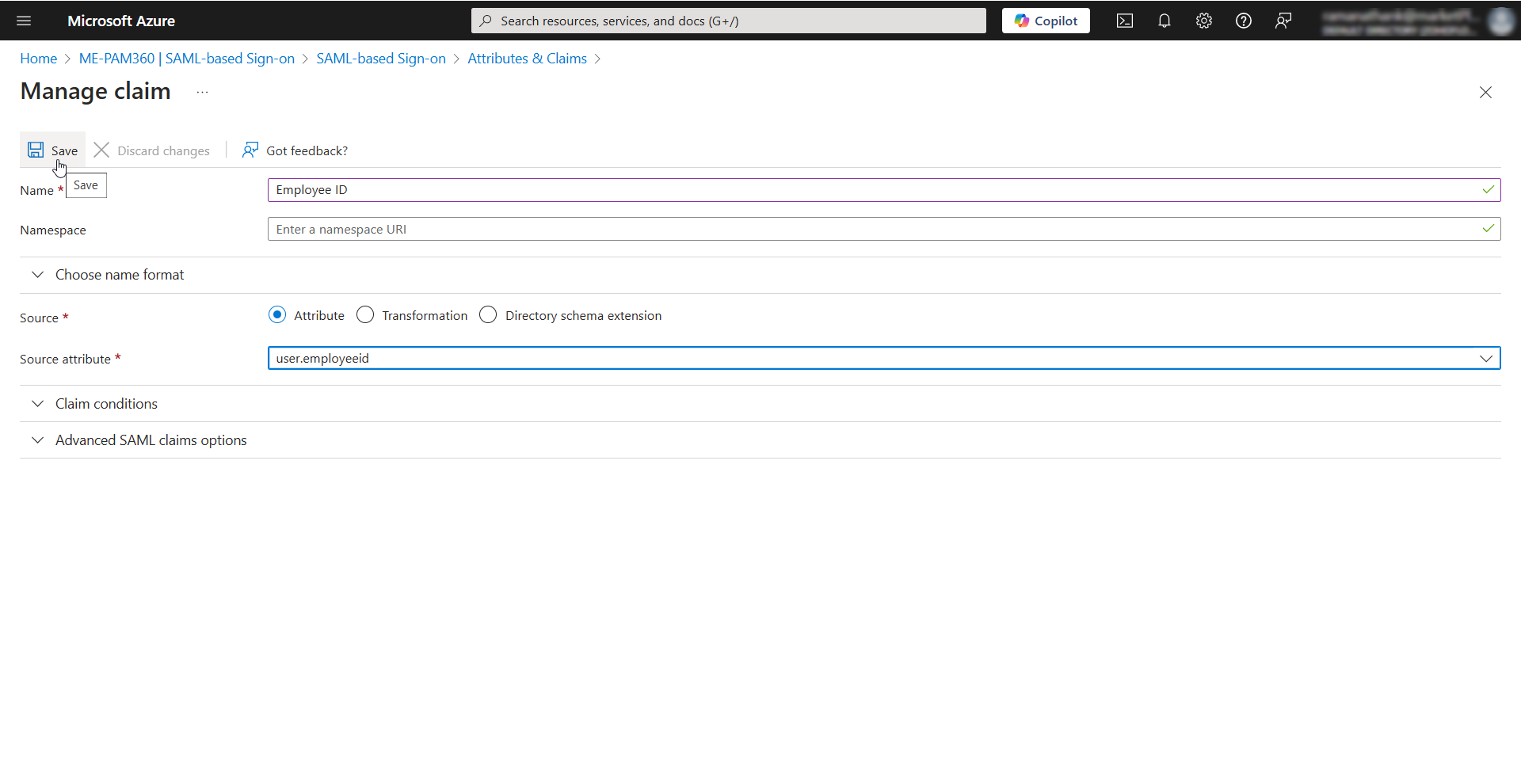 - Source Attribute - Select the source attribute you wish to add as a claim. e.g., user.employeeid. This claim must match the PAM360 username for a seamless SAML Single Sign-On experience.