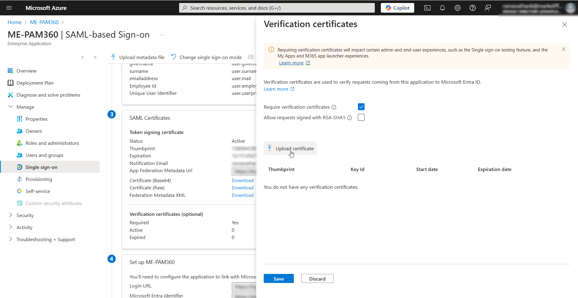 - Click the Upload certificate button and upload the PAM360 SP certificate from your machine.