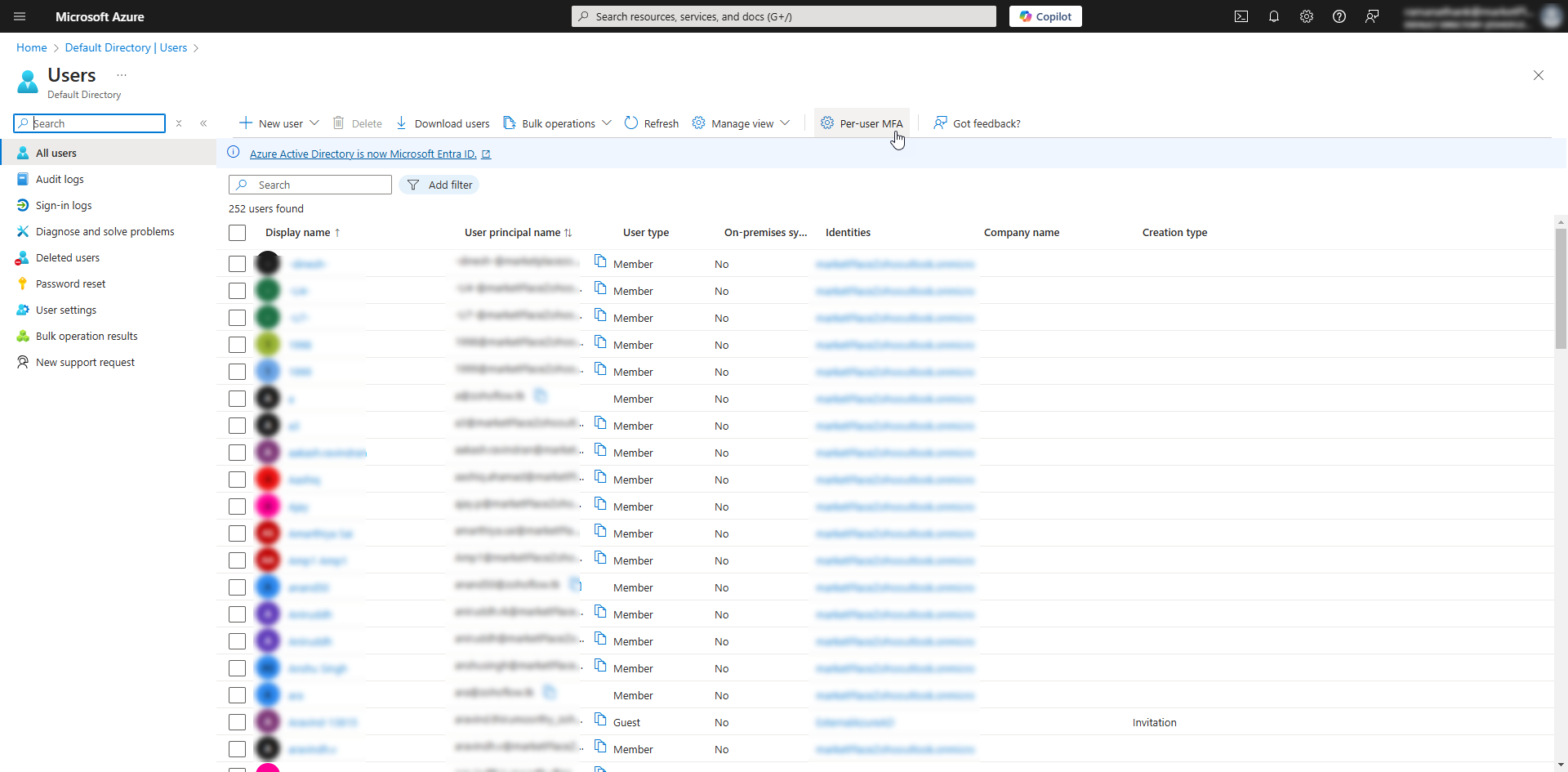 - Click the Per-user MFA option from the top pane on the Users page.