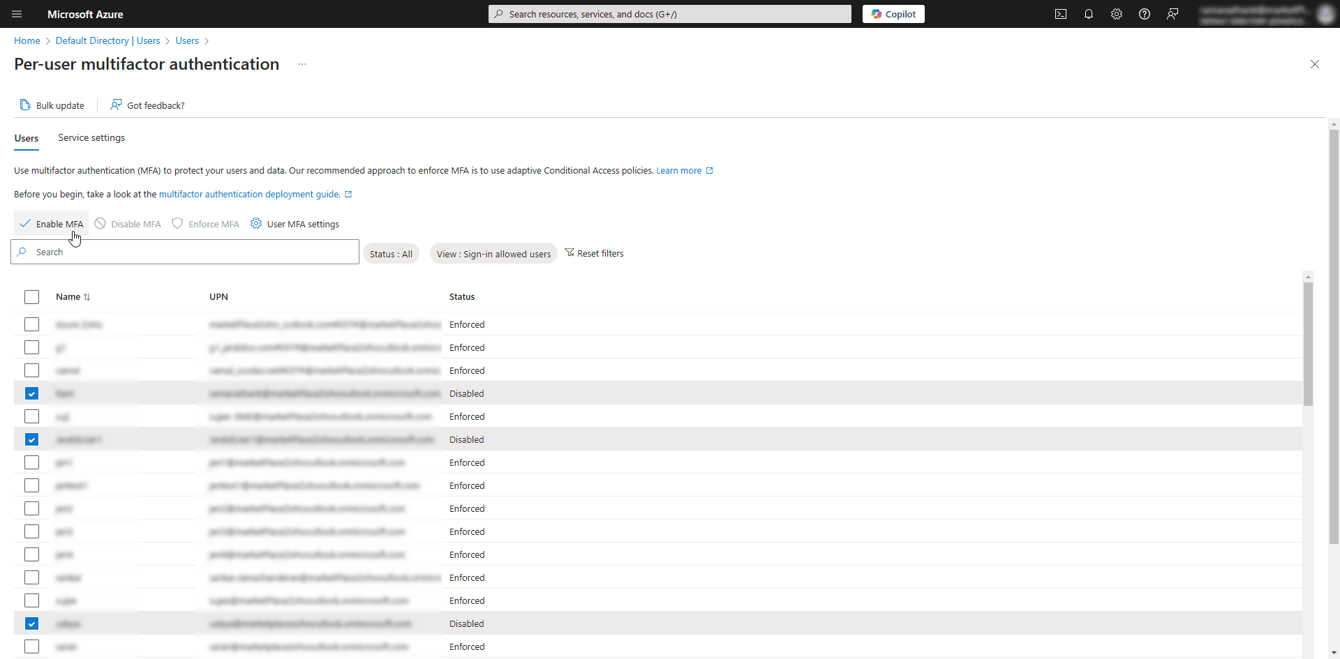 - On the Per-user multifactor authentication page, tick the checkbox beside the desired users for whom you wish to enable multi-factor authentication, and click the Enable option from the top pane.