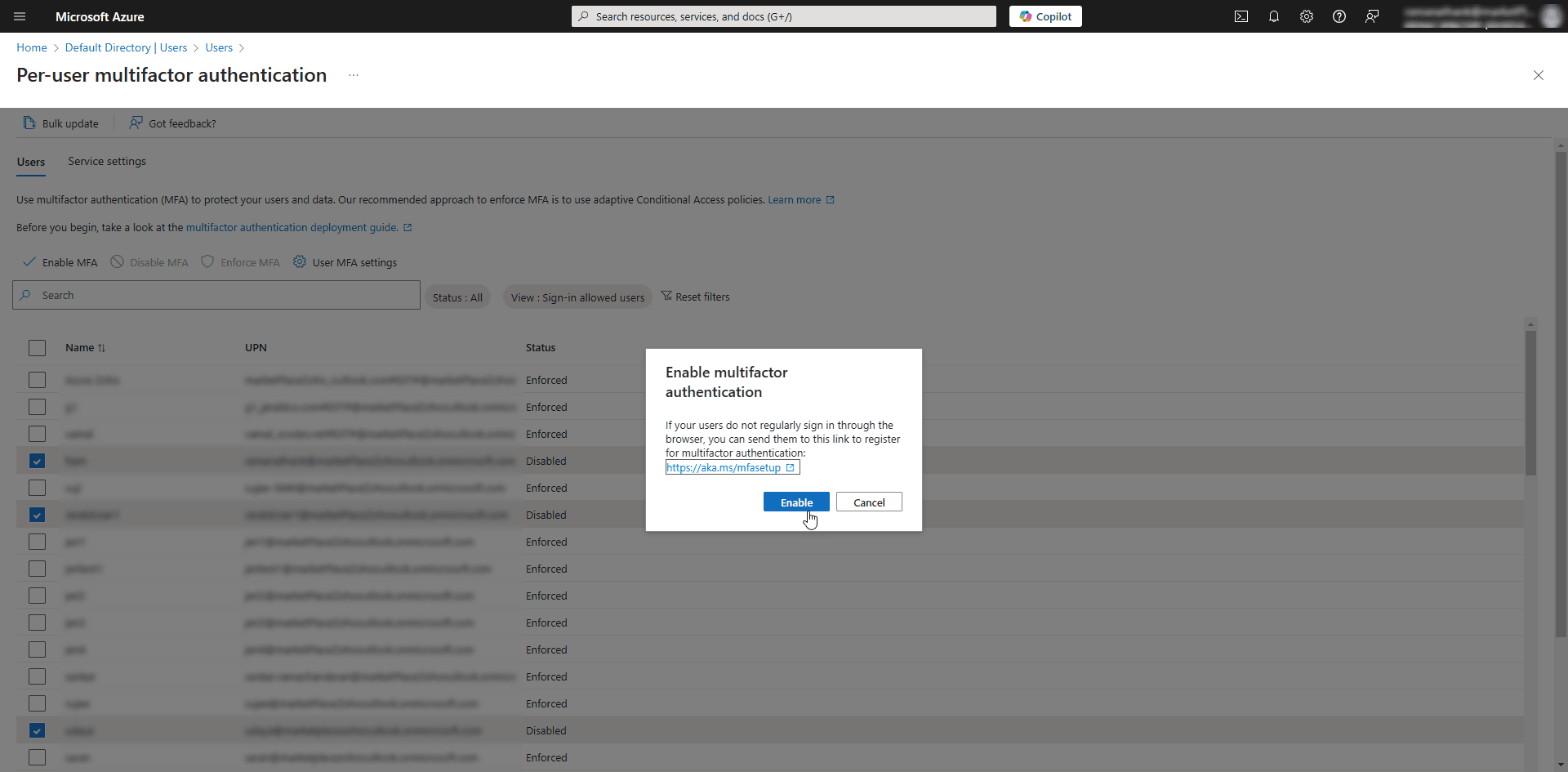 - On the Enable multifactor authentication pop-up window, click Enable to activate the multi-factor authentication for the selected users.