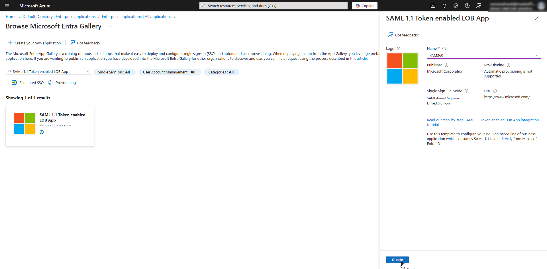 - On the Browse Microsoft Entra Gallery page, find the SAML 1.1 Token enabled LOB App application using the search function and click on it.