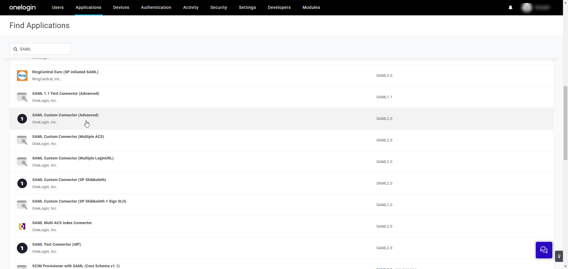 - On the Find Applications page that opens, find the SAML Custom Connector (Advanced) application using the search function and click on it.