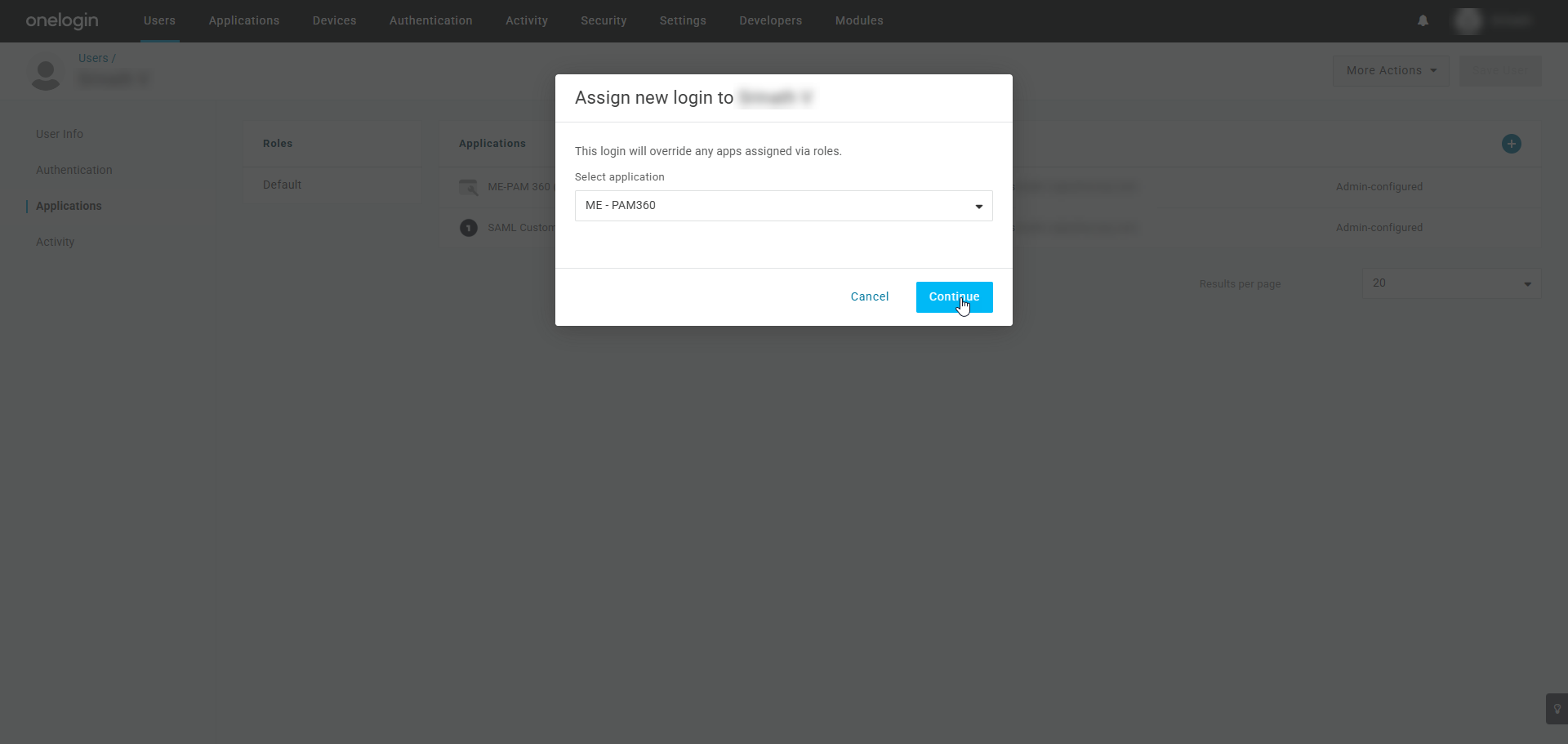 - In the Assign new login to user window, select the application you wish to assign to the user from the drop-down menu, and click Continue.