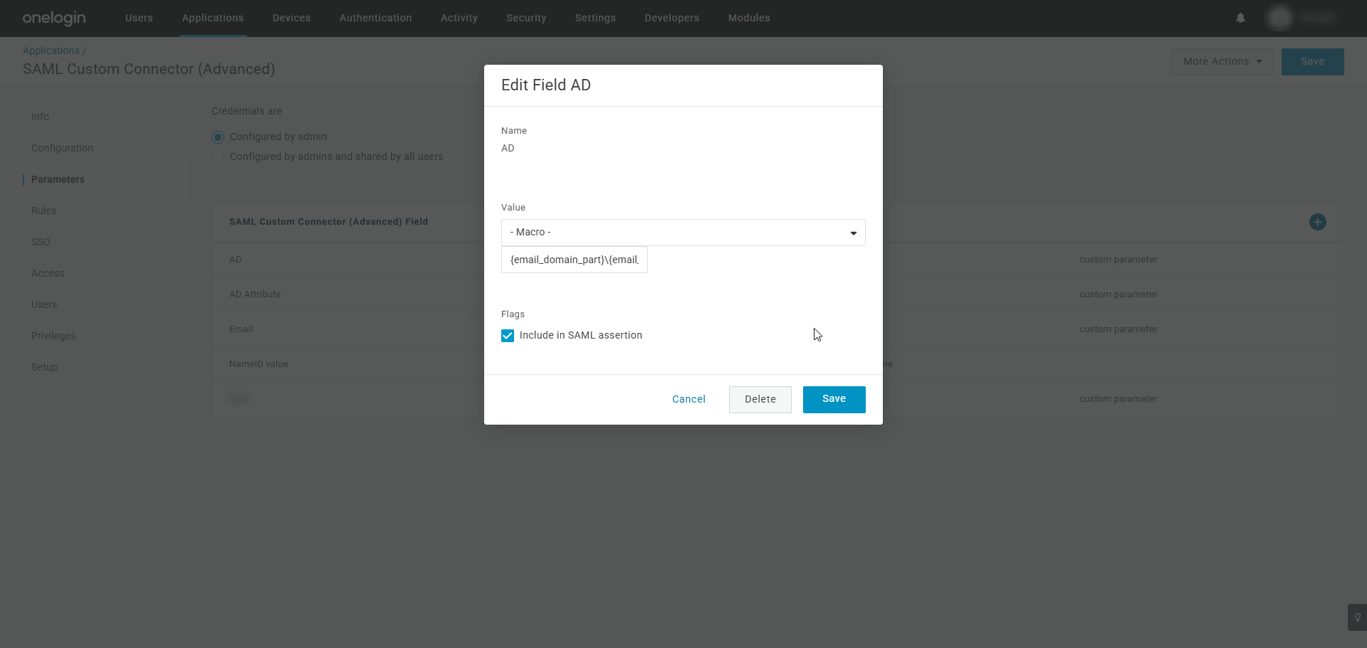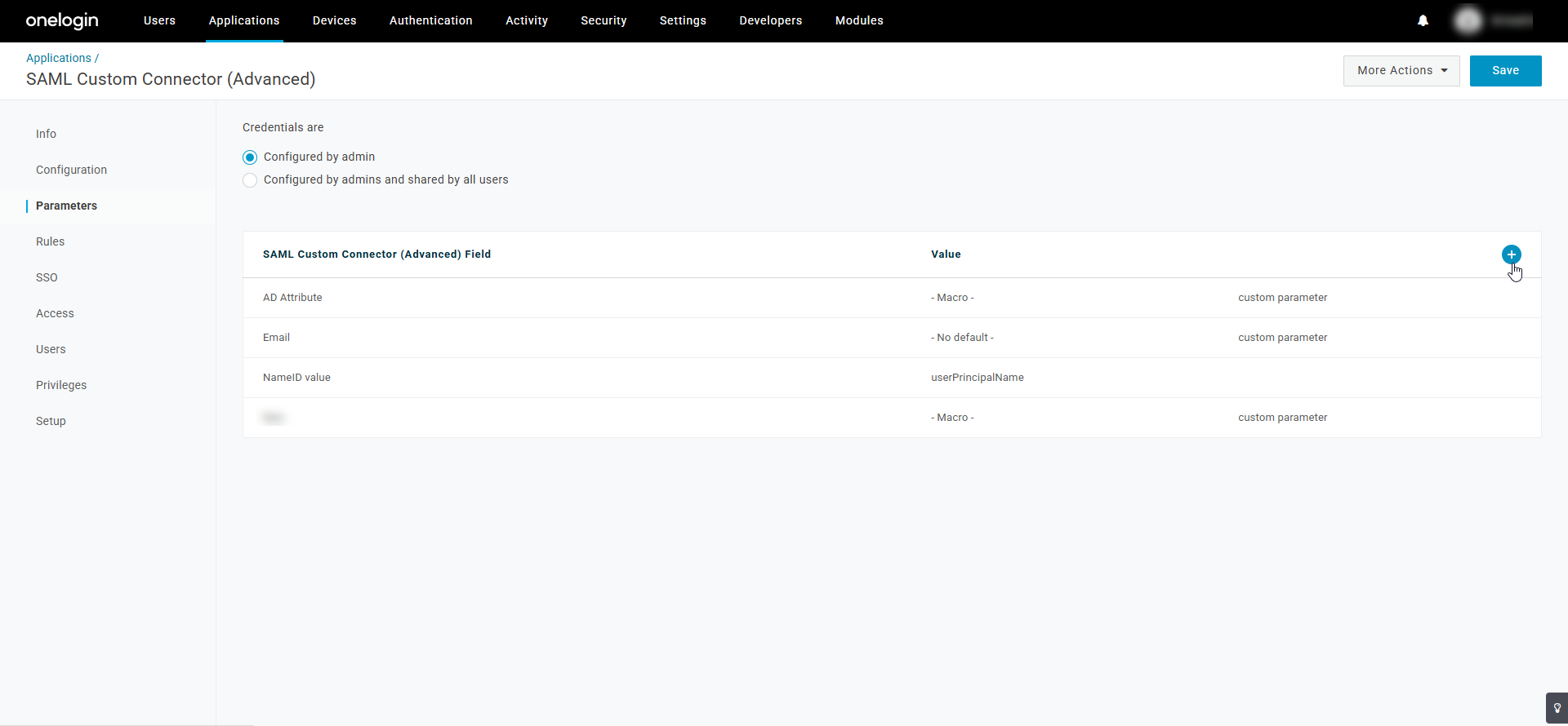 - Navigate to the custom SAML PAM360 application page on the OneLogin portal and switch to the Parameters tab.