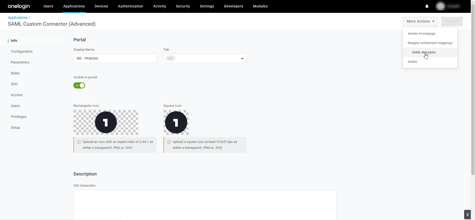 - Visible in Portal - Enable the toggle switch to display the custom SAML application on the OneLogin portal.