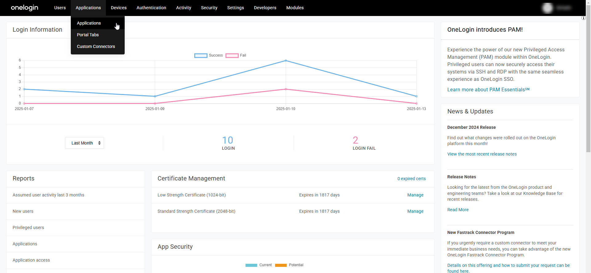 - Log in to the OneLogin portal and select Applications from the top pane.