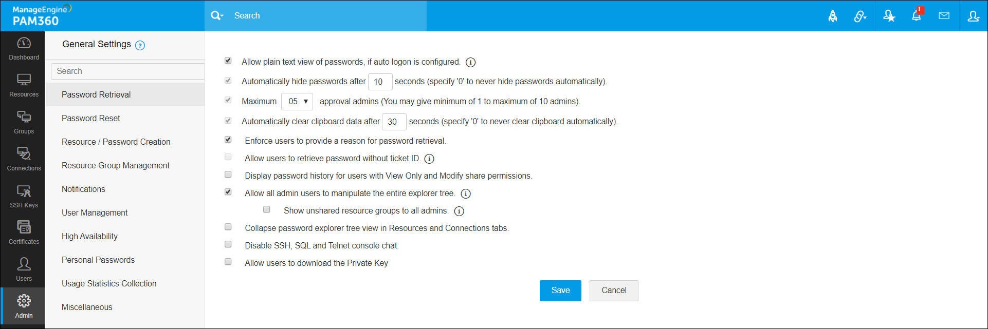 3. Tick the checkbox Enforce users to provide a reason for password retrieval and click Save.