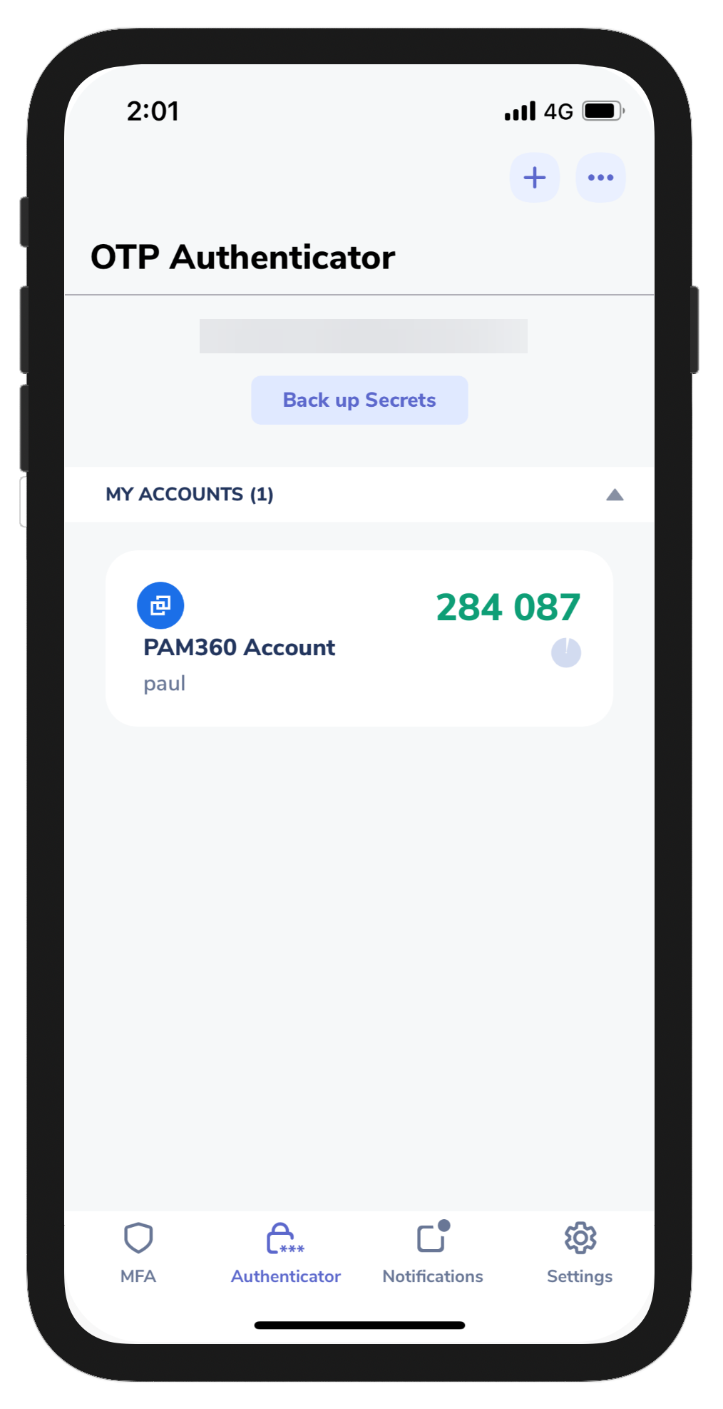- Click Scan a QR secret and point your device to the barcode shown in the PAM360 GUI. This will automatically configure your PAM360 account in the Zoho OneAuth - Authenticator application and will start generating the authentication codes for PAM360.
