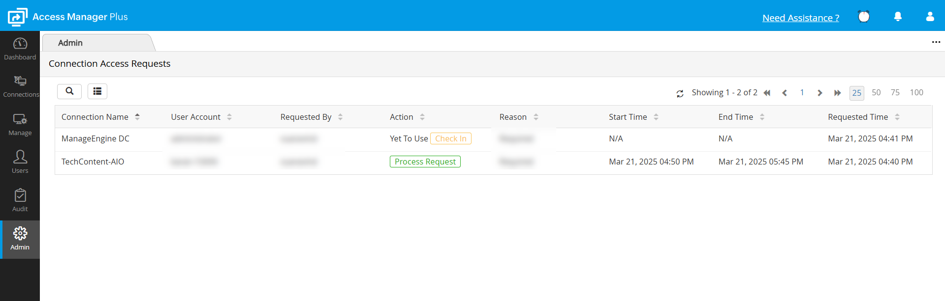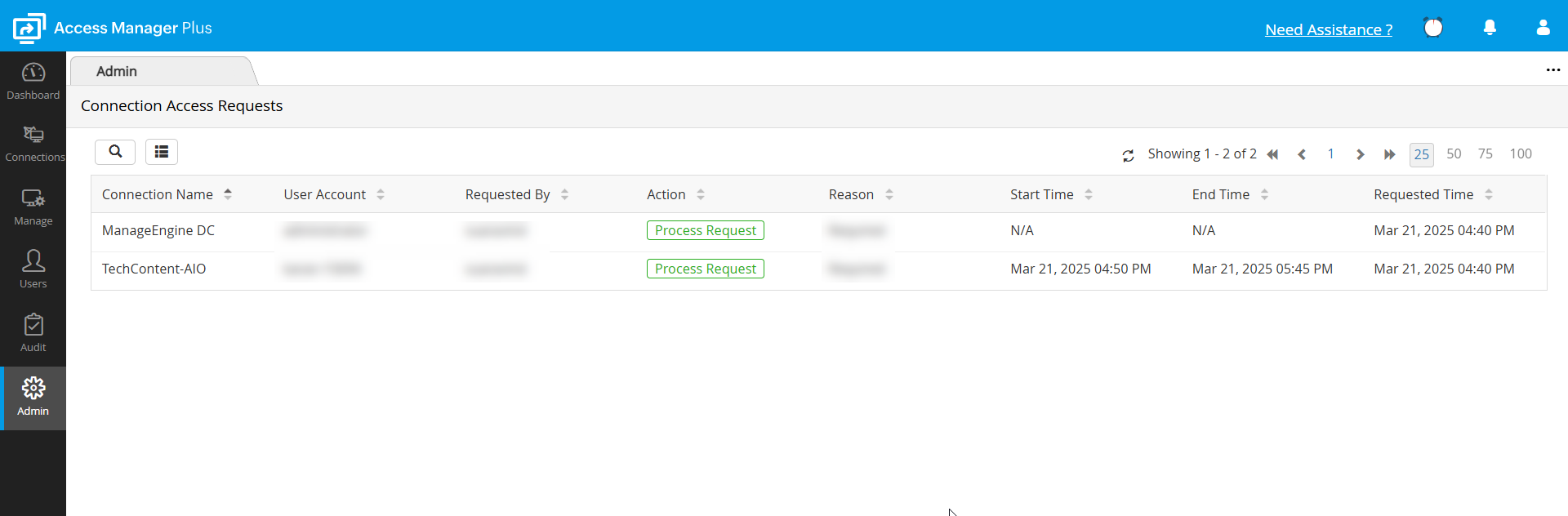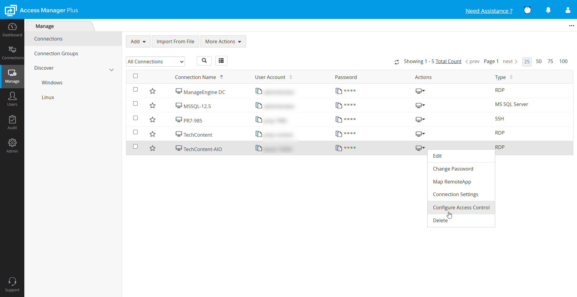 Access Manager Plus provides an access control workflow mechanism that allows users to restrict access to the connections added by them. When the access control is in place, no user other than the one who added the particular connection will be able to view the passwords or launch a remote connection unless their access request is approved by the owner.