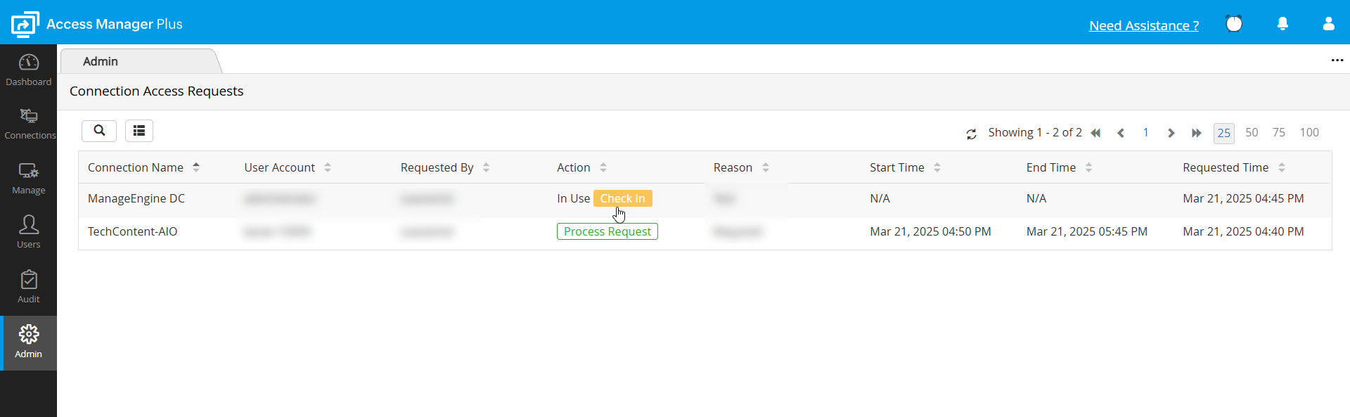To end the connection, click the Check In button beside the connection name. Now, the connection access will be checked back into the system and the status will change to Request again. You will no longer be able to view the password and access the connection. In case you require access again, you will have to go through the request-release process again.