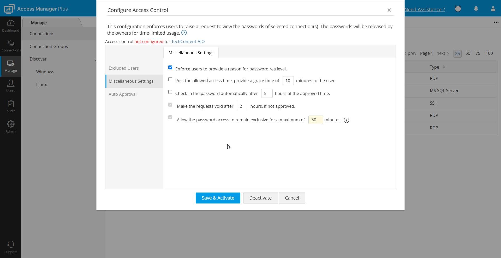 - Allow the password access to remain exclusive for a maximum of X minutes: During the specified time, the password is made available for the exclusive use of a particular user, and no one else, including the connection owner, is allowed to view the password. By default, the password will remain exclusive for the specified amount of time. However, you can modify it to the desired value.