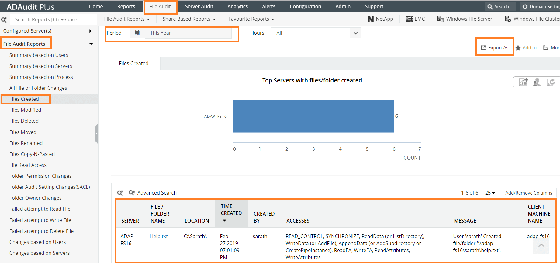 Login to ADAudit Plus → Go to File Audit tab → Under File Audit Reports → navigate to Files Created report to view the files/folders created.