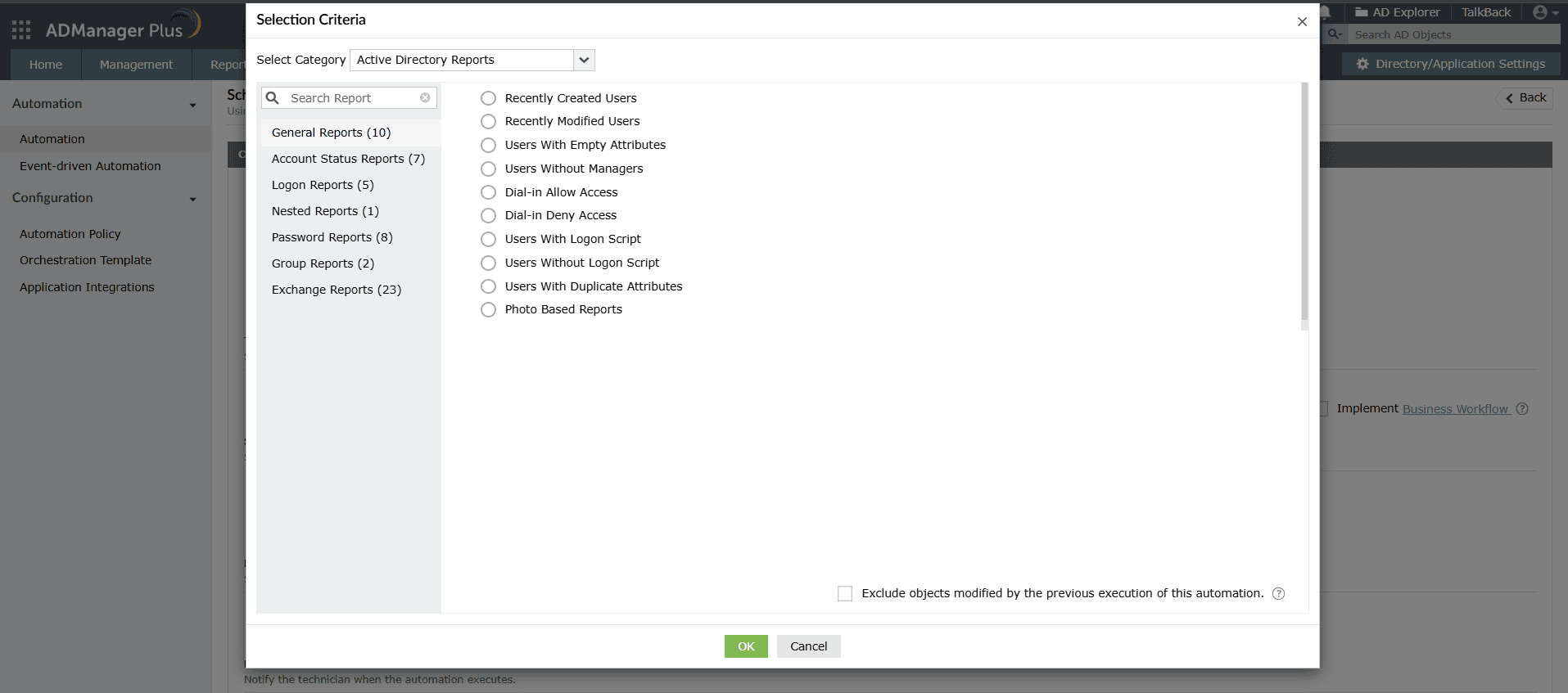 It's all about tracking computer accounts matching a criteria and performing an Active Directory task on them. That's why ADManager Plus offers a "WIDE RANGE OF REPORTS" for selecting computer accounts - a report for every scenario. With criteria needed to select accounts already prepackaged, it becomes very easy for you to configure an automator for your computer account management.