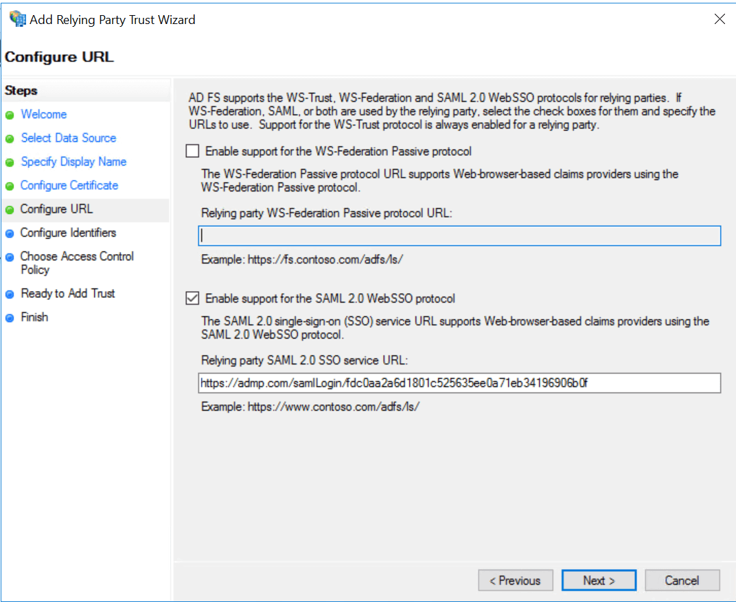 - In the Configure URL page, check the Enable Support for the SAML 2.0 WebSSO protocol box.