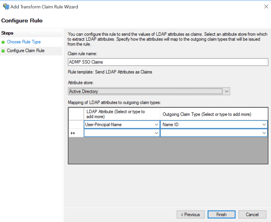 - Follow the steps given in this article to create LDAP attributes claim rules.