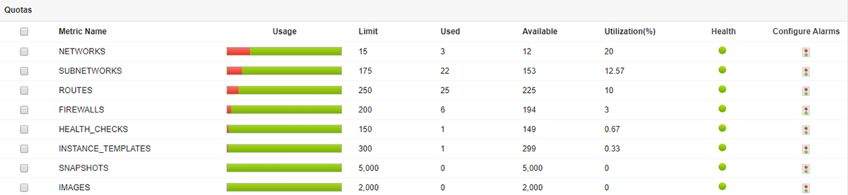 GCE enforces limits on the number of resources a project can consume. Applications Manager's GCE monitoring tool enables you to track quota limits to measure resource consumption over time, prevent unforeseen spikes in usage, and anticipate and resolve potential issues before end users are affected.