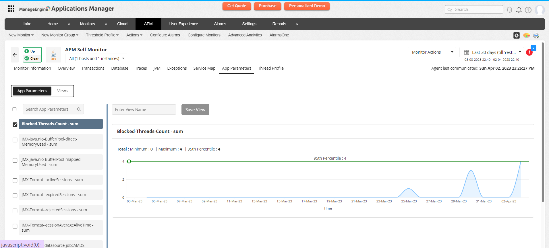 Note: In APM Insight versions 16560 and below, the average data for the last 5 minutes is fetched while applying a threshold for the respective attributes by default. Users can update the 5 minutes interval in the apminsight.properties file under <Applications Manager Home>\working\apminsight\conf directory (Key Name: attribute.update.timeinterval). Restart is required to apply these changes.