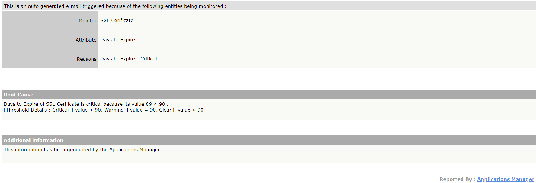 Our SSL monitor keeps track of the expiry date of the certificate and the number of days left to expiry. By defining thresholds for the expiry date, you can trigger Applications Manager to alert you and escalate it. Track and monitor SSL certificate expiry to help renew certificates proactively and lower the likelihood of website failures and service downtime caused by expired TLS and SSL certificates.