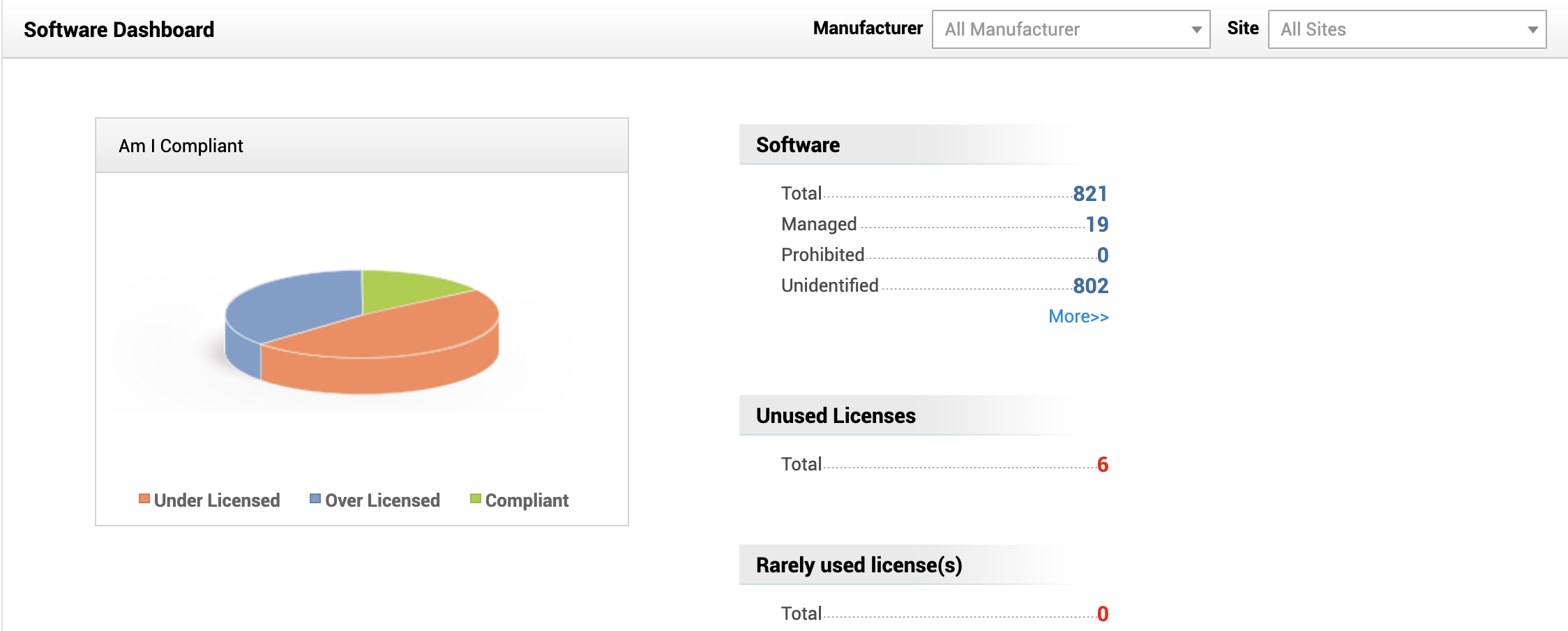 Software Asset Management helps you keep track of all your software assets and licenses. You can group the software through various categories such as Software Type, License Type, vendor name etc. The flash charts gives a easy-to-understand view of software compliance in your network.