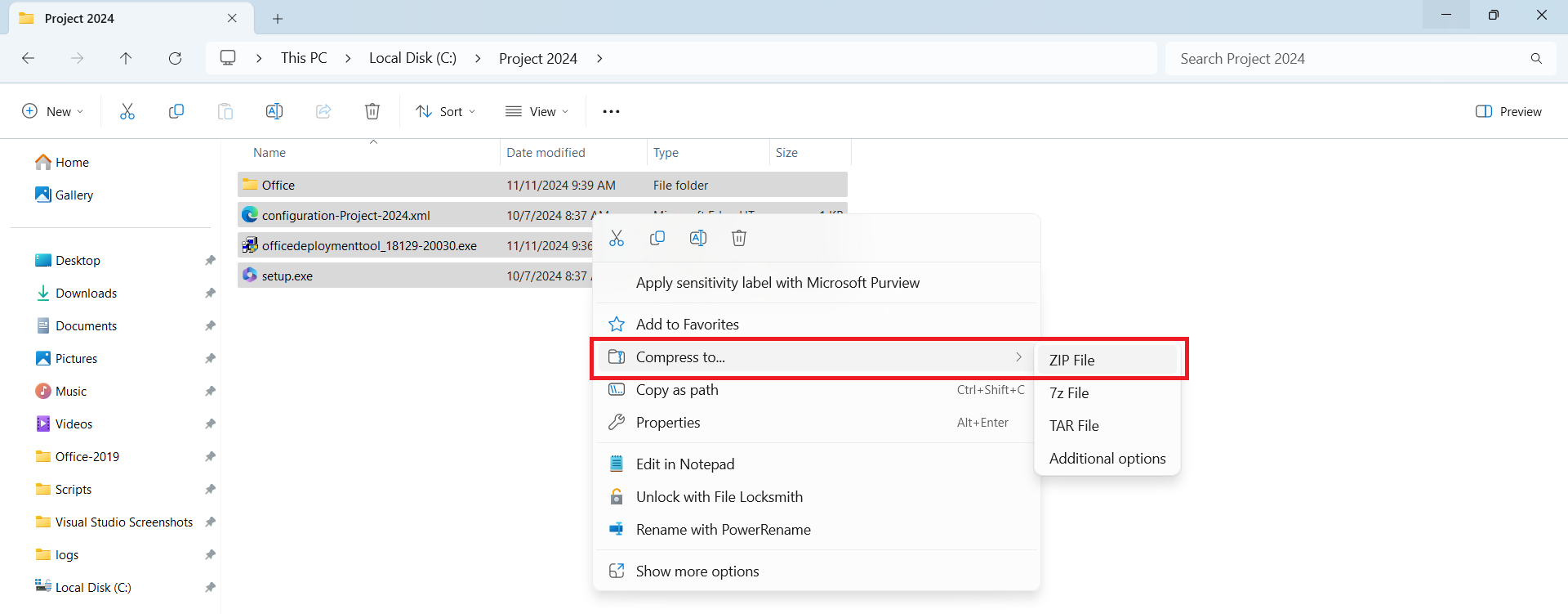 - After downloading the package, you can deploy it through Endpoint Central. If you are planning to deploy via HTTP, zip the office folder that was downloaded in the above step, appropriate customised xml file and the setup file as shown in the below image. Add the zipped folder in the HTTP path.