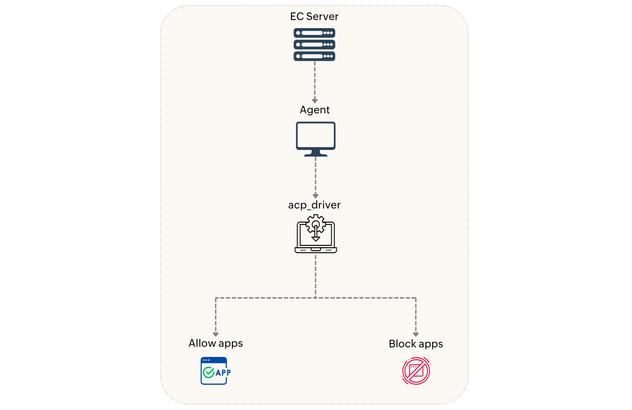 The Application Control policy will be received in the agent and is enforced by the kernel mode driver named acp_driver. The driver filters through the newly created processes and allows only the authorized applications to run according to the deployed policy. The policy will be enforced on the .exe and .msi applications. The audited and blocked application events will be posted in the 90-min refresh cycle.