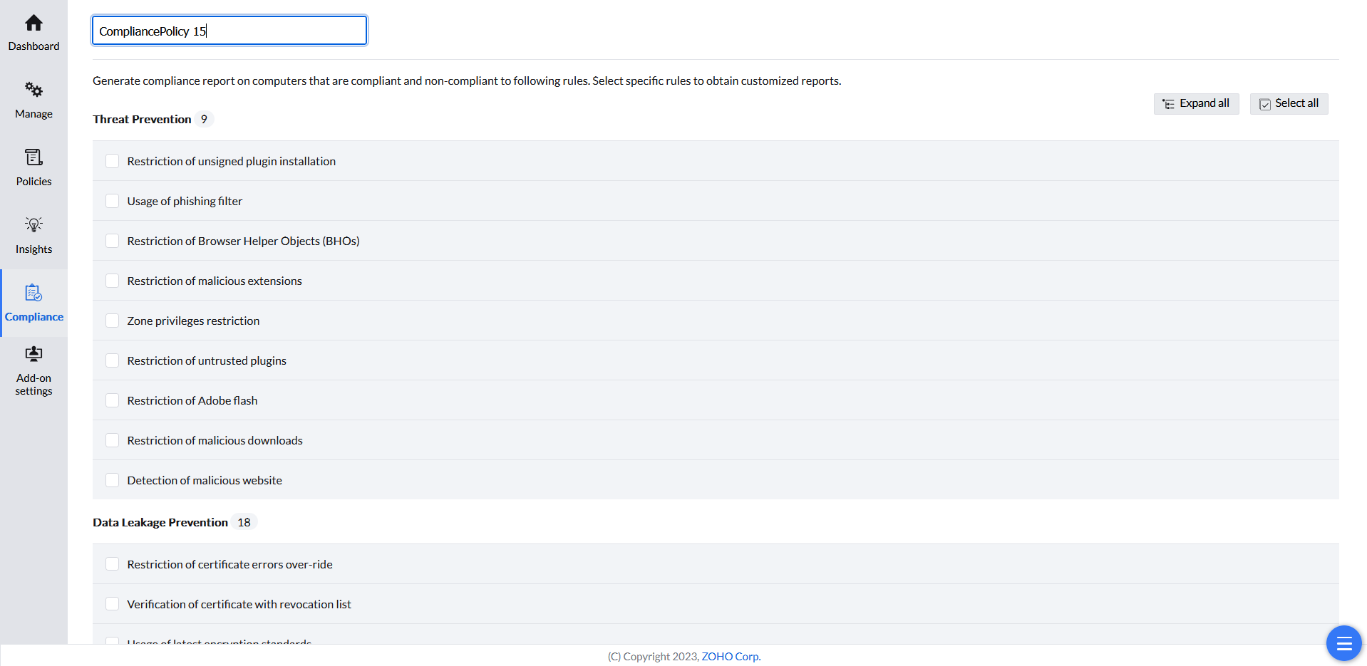Compliance reports are initially generated based on 30 predefined security configurations. You can customize these reports by removing irrelevant standards and focusing on the specific criteria that align with your organization's unique requirements. Follow the steps given below to create a compliance policy: