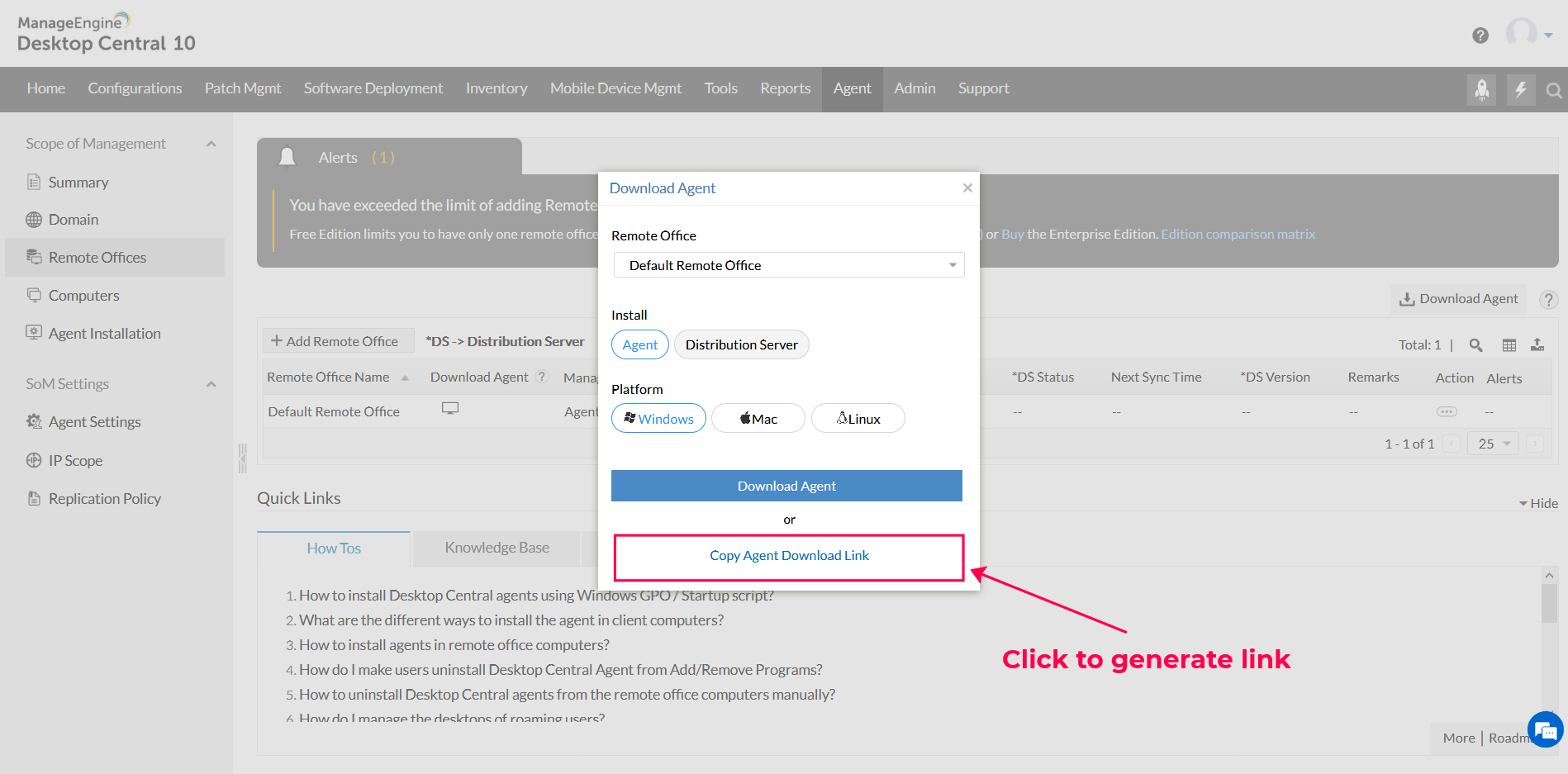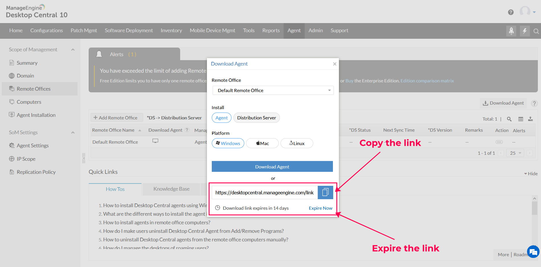 Endpoint Central agent can be downloaded from a copied link. The copied link can be shared to end users who could then download and install the agents in their machines. This option is available on clicking Download Agent from Remote Offices or Computers tab. On clicking copy option, the URL for the selected Remote Office will be created. The default expiry time of the URL is 15 days. Using the copied link, agent can be installed:
