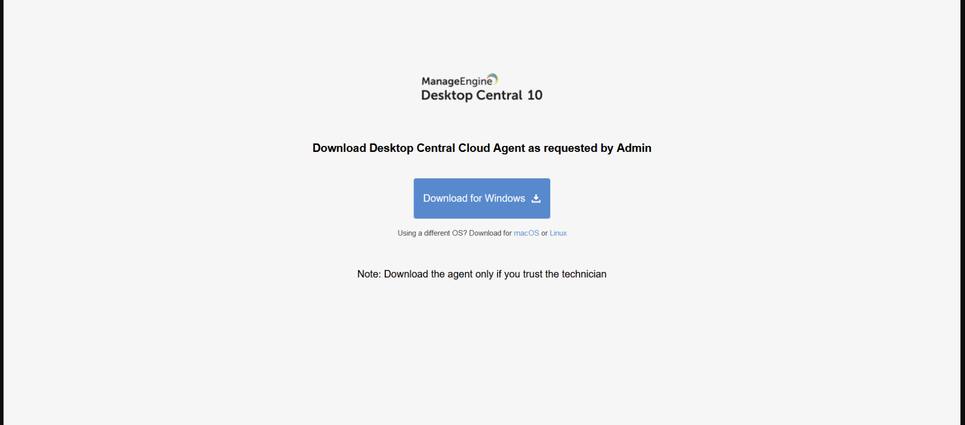 On visiting the copied URL from the browser, the user will be presented with an option to download the agent. The user has to select the OS and the agent download will be initiated. If the user visits the URL from an unsupported browser, an error page will be displayed. If the user visits the copied URL from a supported browser post the expiry time, the error page will be displayed.