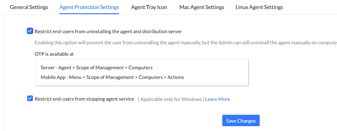 If you enable the option, "Restrict end-users from uninstalling the agent and distribution server" and click Save, it will prevent the user from uninstalling the agent manually, but the Admin can still uninstall the agent manually on computers through OTP.