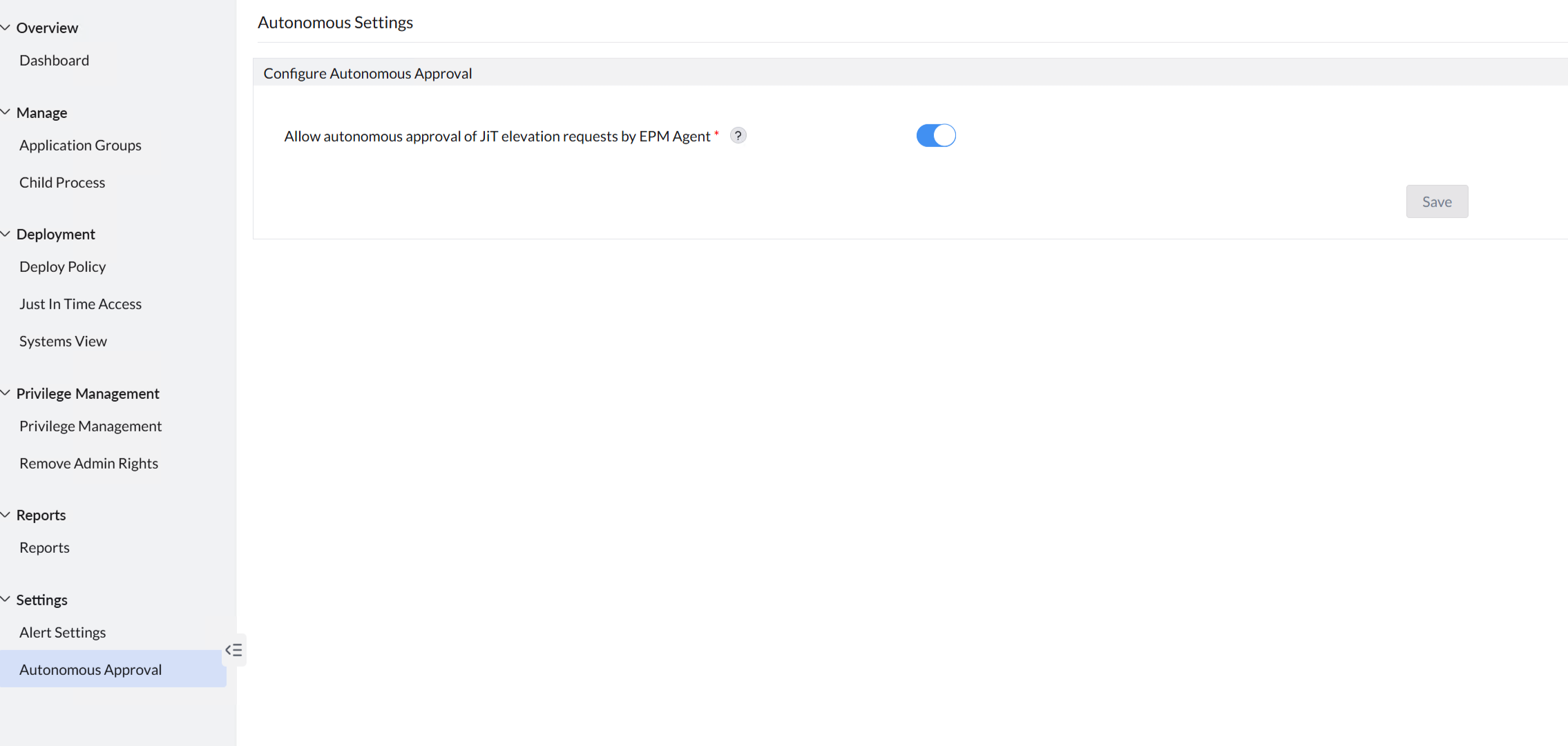 To streamline the approval process for trusted users or low-risk applications, administrators can enable Autonomous Approval. When configured, eligible elevation requests are automatically approved without requiring manual admin intervention. This option can be enabled under Settings → Autonomous Approval.