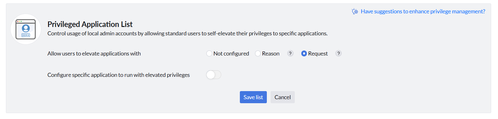 Navigate to Privilege Management and click Create for configuring a new list or Modify for updating the existing list. The applications can be run with elevated privileges in the following ways: