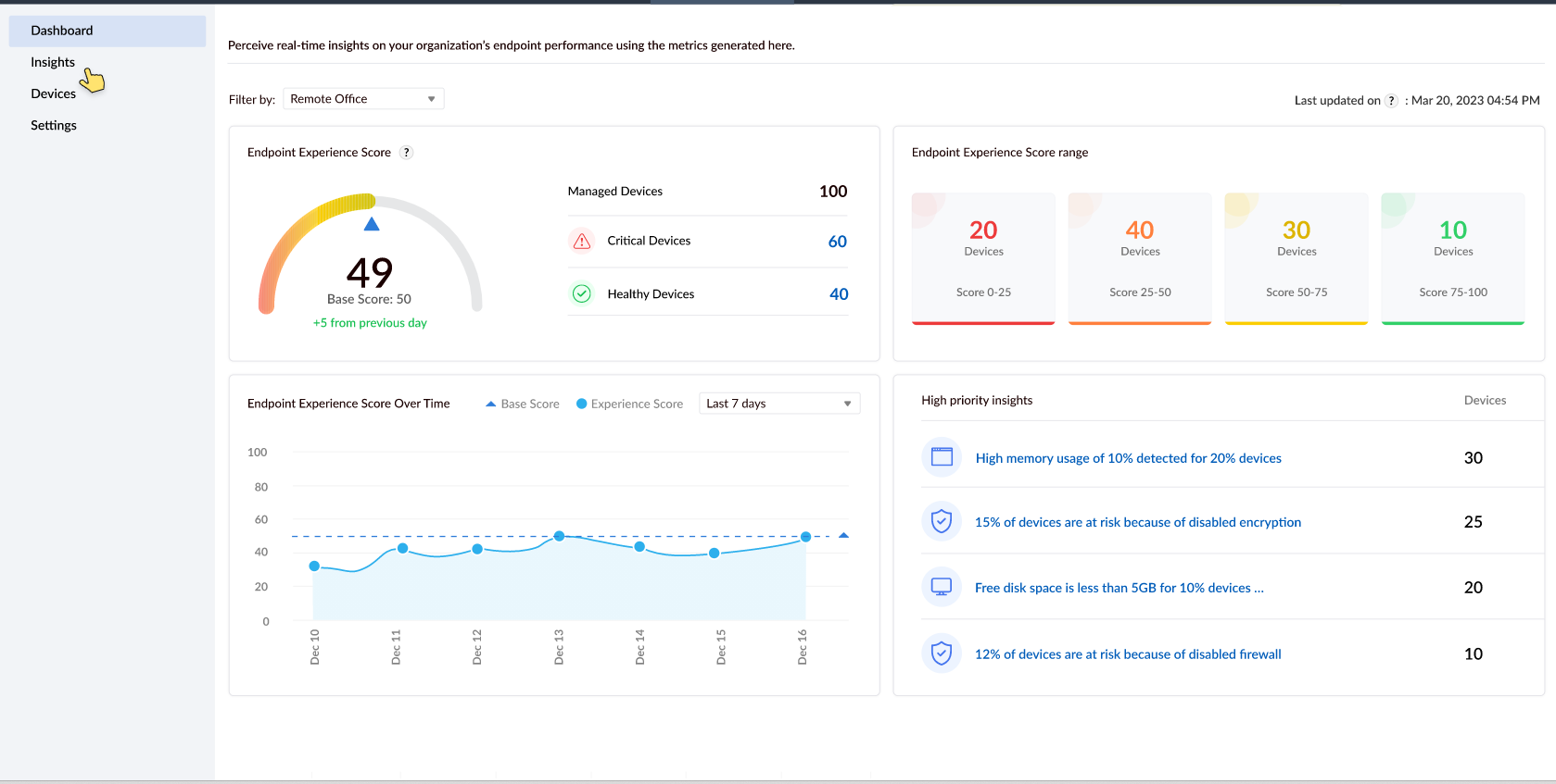 Baseline score is the minimum score assigned to your endpoint network. When the endpoint experience' score falls below the baseline score, it is an indication of an unhealthy experience. IT administrators can configure this baseline for their network based on the business requirements.