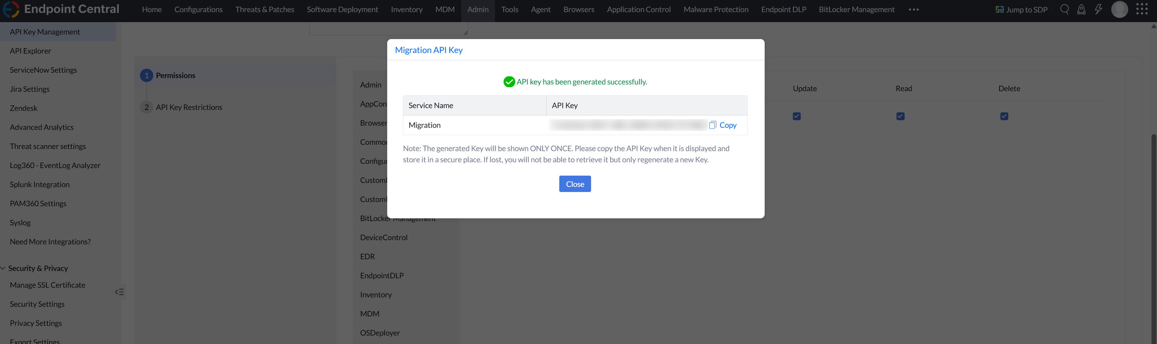 • Now, the API Key is generated with All the permissions.