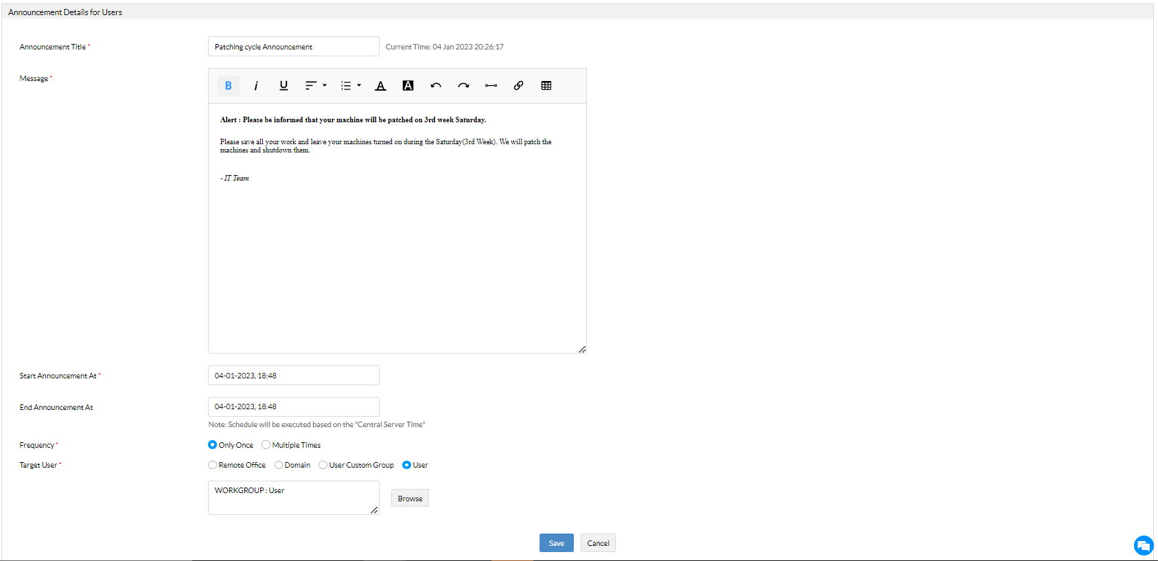 Send out unlimited announcements or alert notifications to all end users and computers, inside or outside your corporate network using Endpoint Central. In just one step, the message is delivered to all selected users. In critical situations where emails aren't reliable, Announcements help display information instantly on all targeted endpoints.