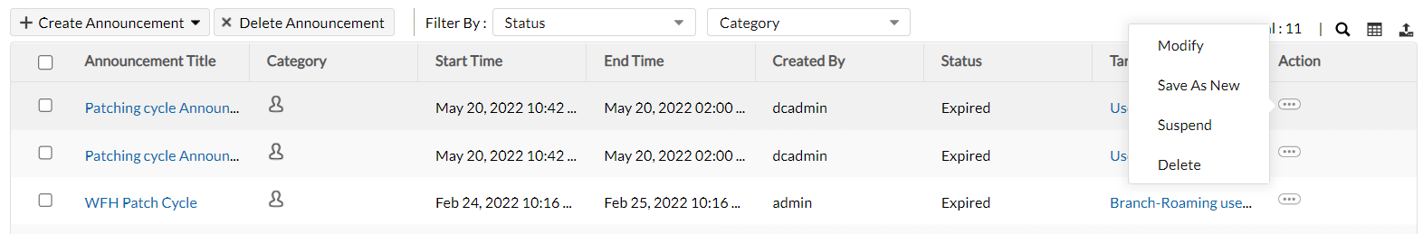 Use the Actions menu (three dots) to perform the following on an existing scheduled announcement: