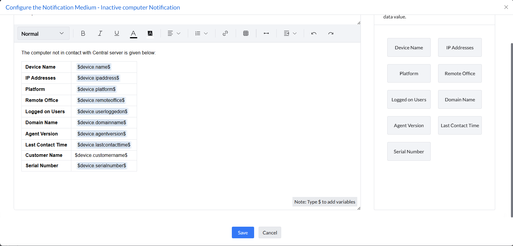 - If you select Configure: Opens a new window for adding variables to customize notifications.