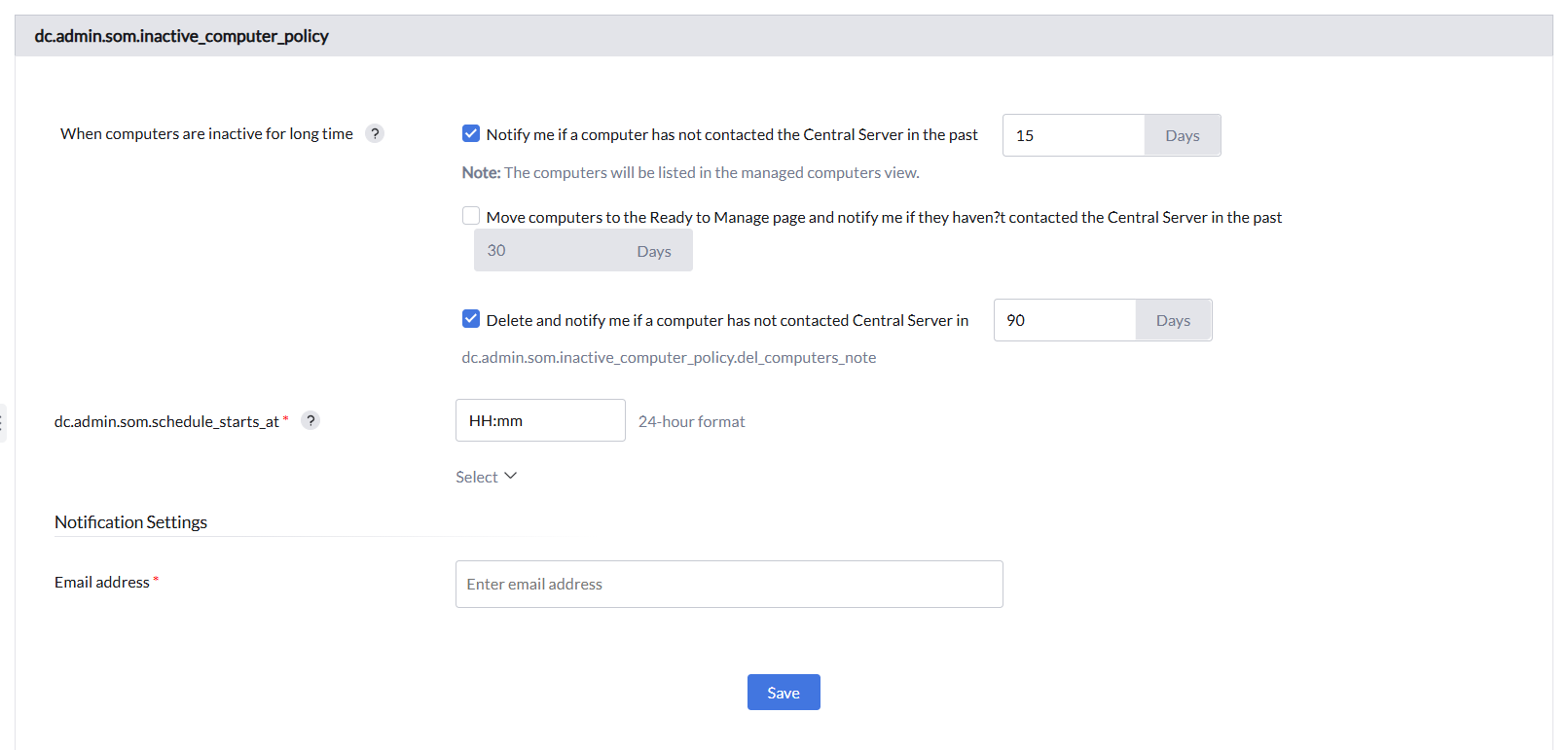 - If you select Delete and Notify me if a computer has not contacted the Central server in the past 'n' days: The computers that has not contacted Central Server in the number of days specified will be deleted and notified via the mail address configured in the notification settings.