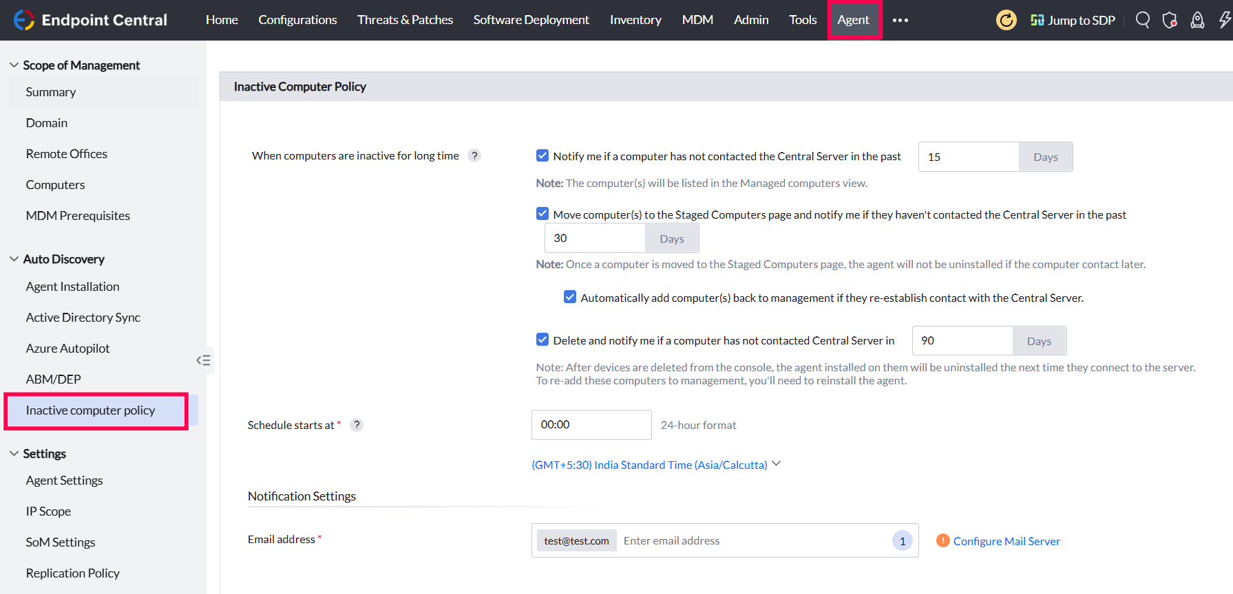 - Schedule starts at:The Central Server will check for last contact time of the agents. If the specified criteria is met, it will send notification or remove the computer from the scope of management. This schedule will run at the specified time everyday.