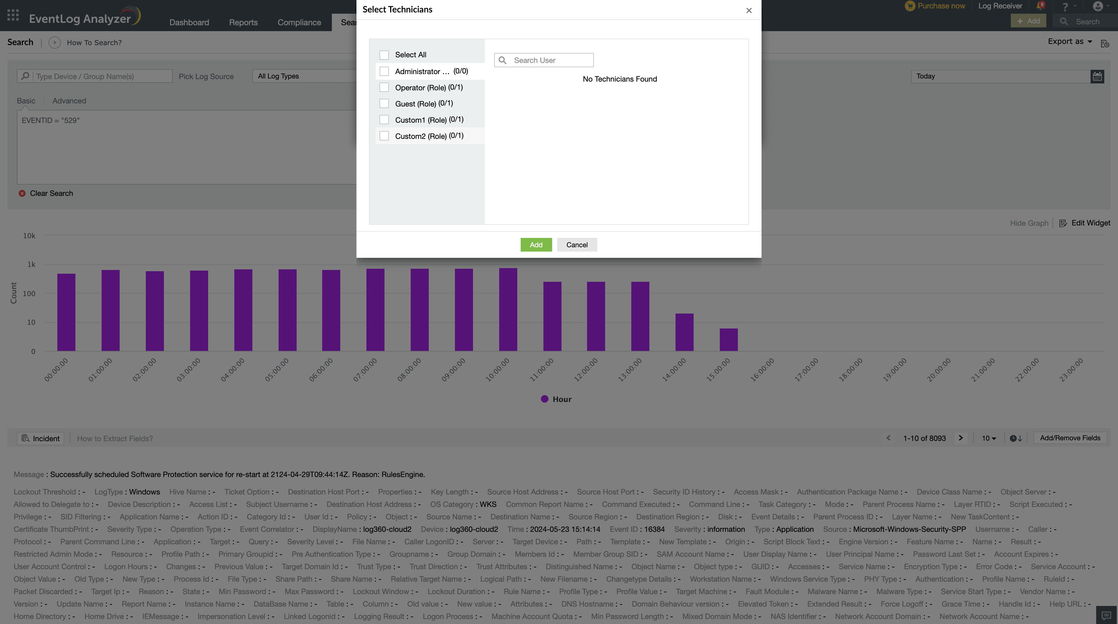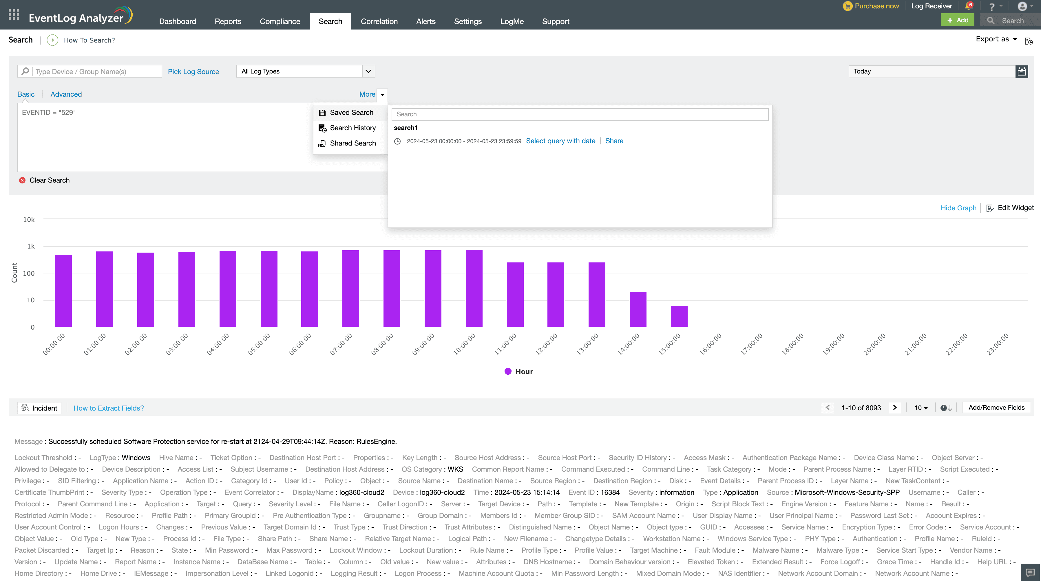 EventLog Analyzer drills down to the raw logs when retrieving results for your search query. The results can be saved, or used to create report and alert profiles.
