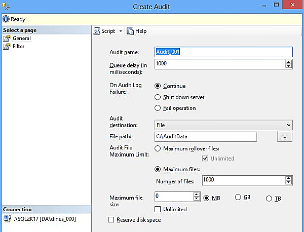 An SQL Server Audit object is an object created in the audited SQL Server instance. Define the target for monitoring events at the server and database levels. You can define multiple audits for a single SQL Server instance, and each audit stores audit information in a separate target file. The destination type (binary file, security protocol, or application protocol) and path are defined. The audit does not specify what was recorded. No event type, object, or database is specified here. Now, let us create an SQL Server Audit event.