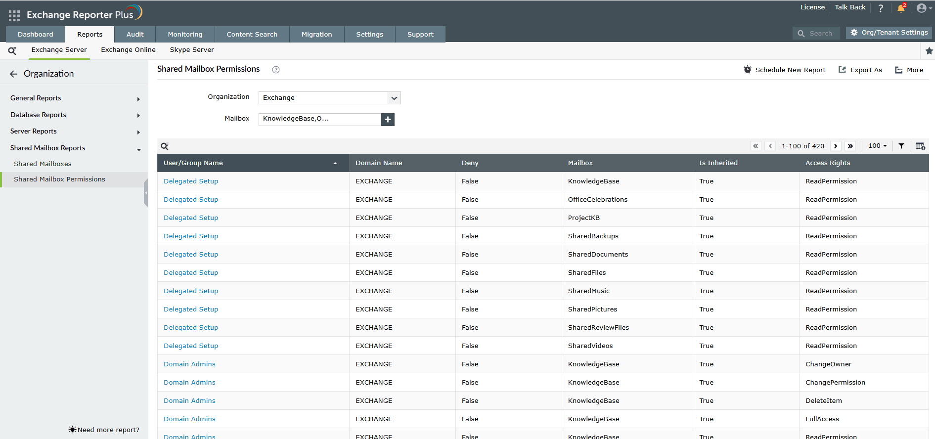 Get granular details about users' and groups' shared mailbox permissions. With Exchange Reporter Plus, you can:
