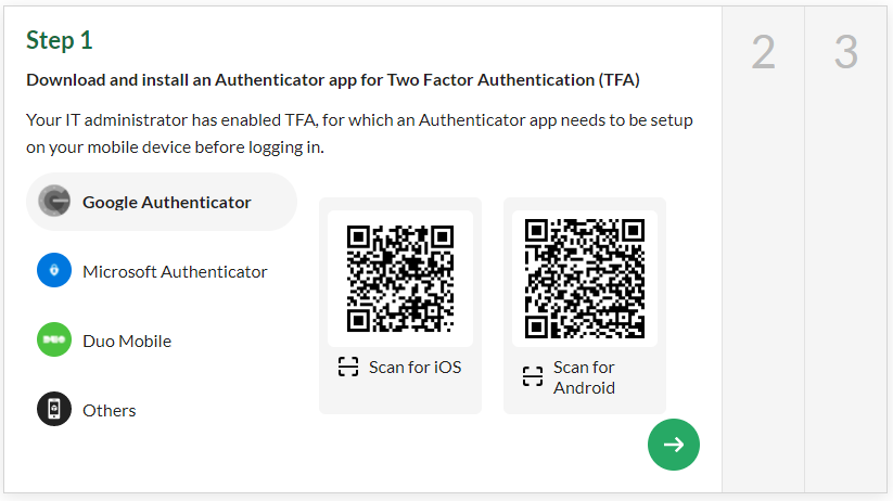 Note: If 'Authenticator Apps' is chosen as the mode of Authentication, all users will be prompted to set up their Authenticator app during their next login.