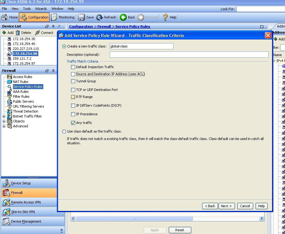 To enable the ASA to start sending information to the NetFlow Analyzer defined above you need to go to Firewall > Service Policy Rules.
