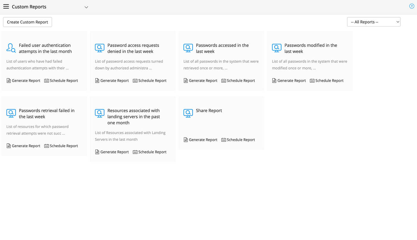 Build comprehensive reports on policy violations, password access, and global IT standards with customizable query-based visualizations.